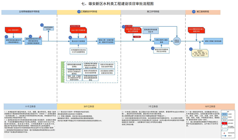 (七)水利类项目。包括防洪、行洪、调蓄、输水等项目,涉及审批事项19项。其中,在立项用地规划许可阶段需办理“建设项目用地预审与选址意见书”“政府投资项目可行性研究报告审批”“建设用地规划许可证核发”“水工程建设规划同意书审核”;在工程建设许可阶段需办理“水利基建项目初步设计及概算审批”“建设工程规划许可证核发”;在施工许可阶段需办理“水利工程开工报告备案”;在竣工验收阶段需办理“建设工程竣工验收备案”。