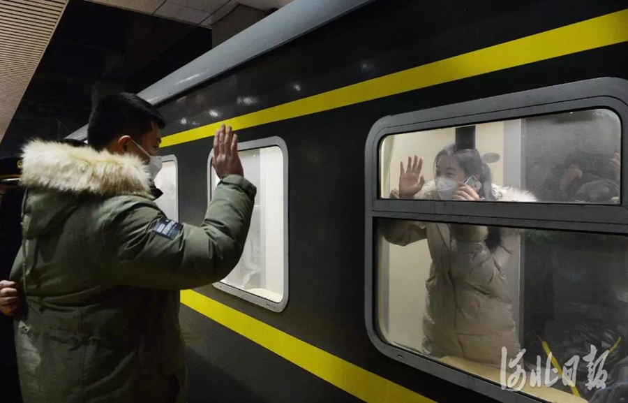 图为医疗队队员赵紫薇(右)与老公陈东阳在站台挥手送别。河北日报记者张昊摄