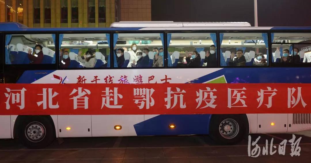 图为医疗队队员登车后向记者挥手告别。河北日报记者张昊摄