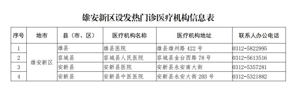 雄安新区设发热门诊医疗机构名单公布