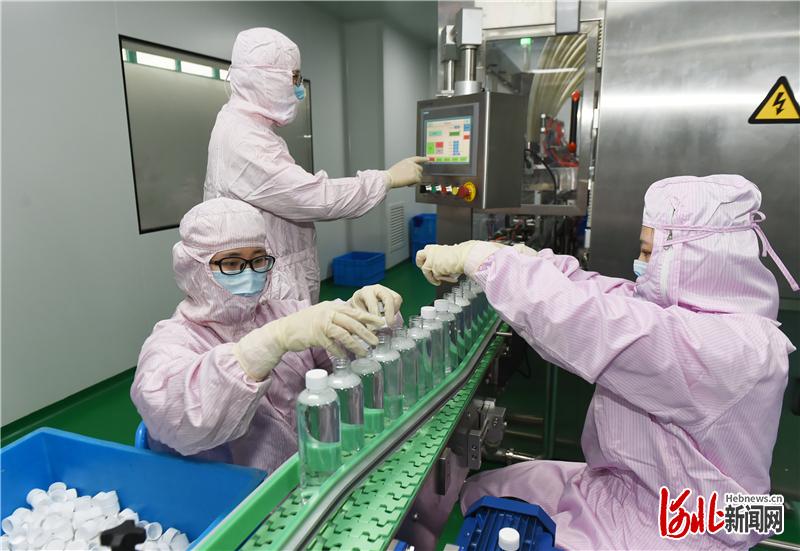 2月1日,在河北石家庄四药有限公司灌装车间,职工在对消毒液进行灌装作业。目前,河北石家庄四药有限公司的职工们正加紧生产疫情防控一线急需的盐酸阿比多尔胶囊、盐酸莫西沙星氯化钠注射液、消毒液等产品,保障供应。 河北日报记者史晟全 摄