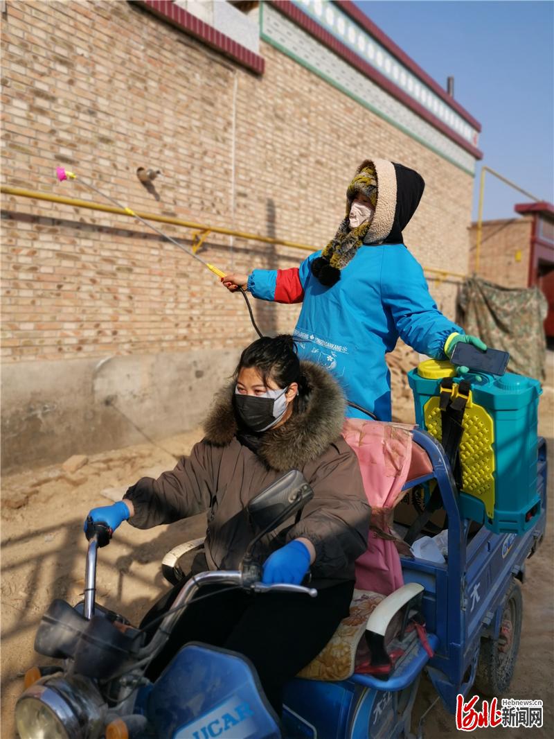 2月2日,河北雄县仁义庄村“巾帼志愿服务队”队员徐静(前)和刘文静在村里进行消毒作业。通讯员 郭 健摄