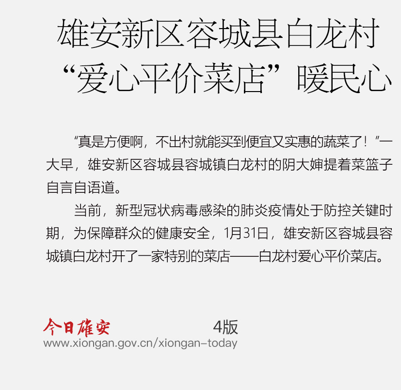 1月31日,雄安新区容城县容城镇白龙村开了一家特别的菜店——白龙村爱心平价菜店。
