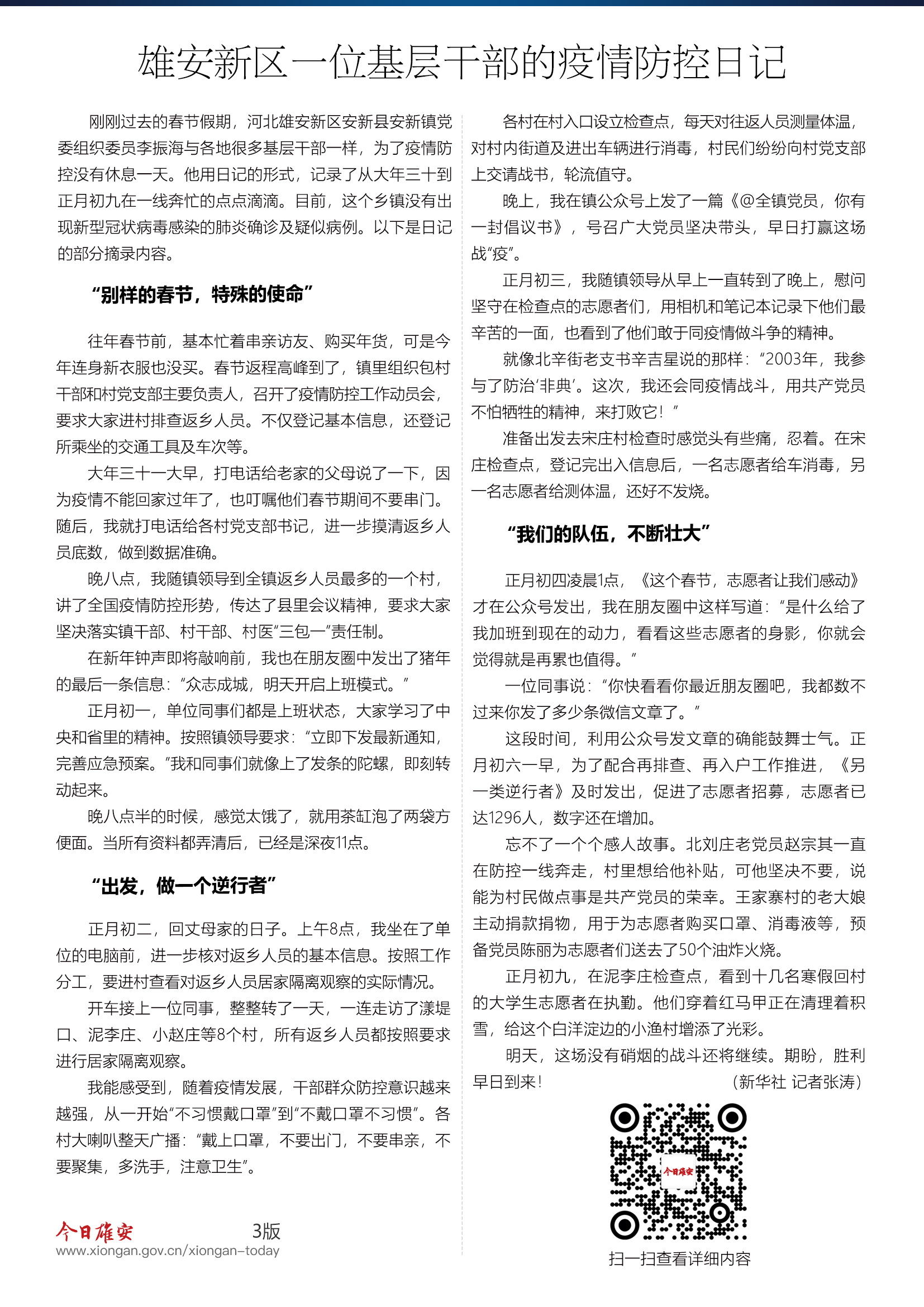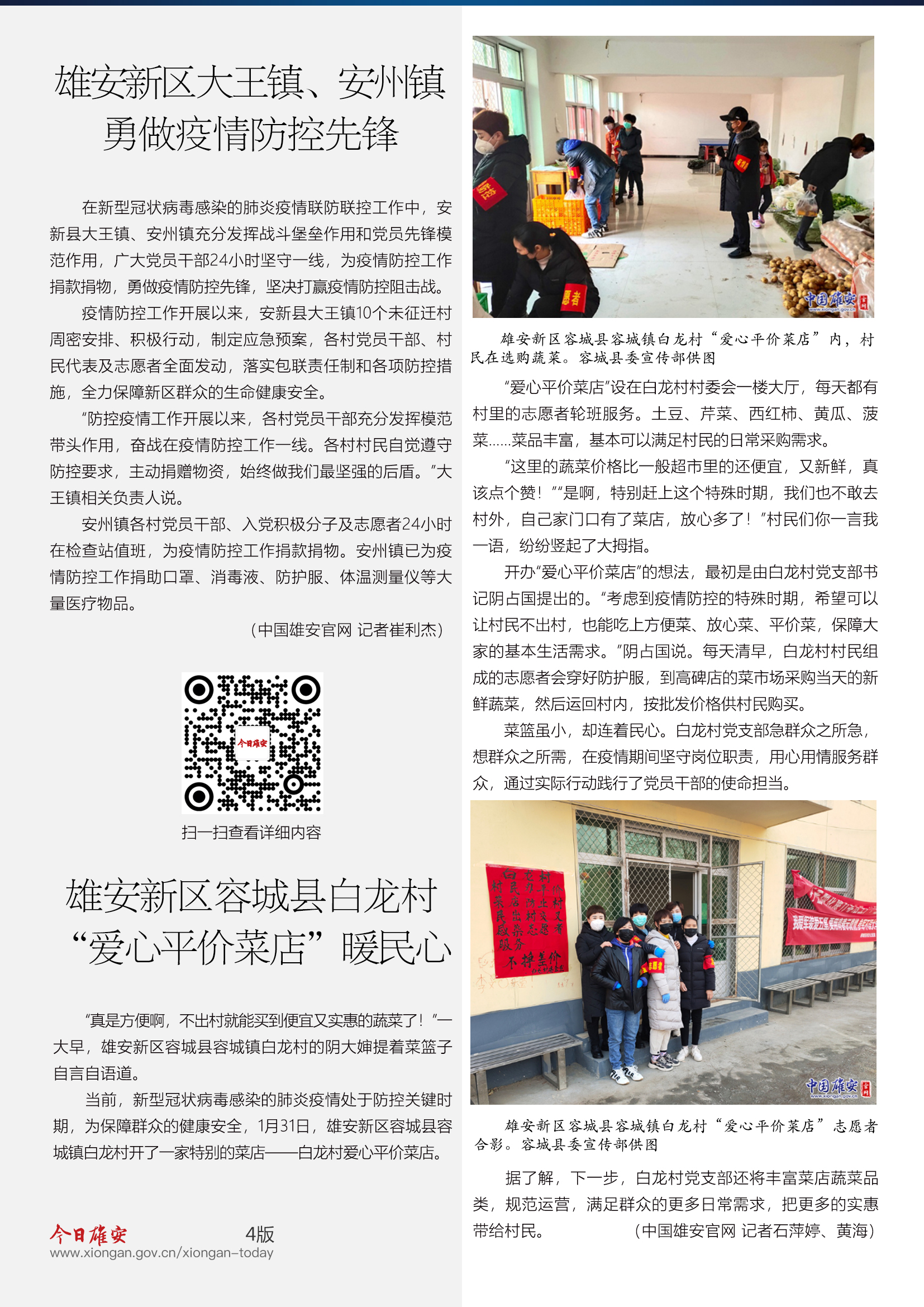 自新型冠状病毒感染的肺炎疫情防控工作开展以来,雄安新区雄县组织全县各级党组织投身防疫一线,迅速采取有效防控举措,充分发挥基层支部战斗堡垒和先锋模范作用,用实际行动践行初心。