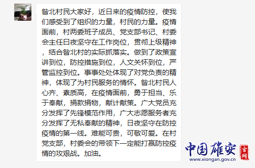 采访时,王红雨总是时不时地看手机,他给记者看了看他的微信。“你看看,就咱们聊天这一会儿,已经有十几个人执意发爱心红包了,大家的爱心真的让我很温暖,也给了我们村两委更大的压力。”王红雨说,“我们将把这种压力转换为动力,做好此次疫情防控工作,为村民的身体健康保驾护航!”