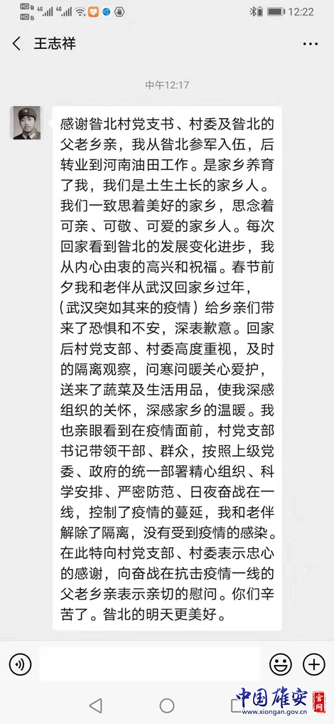“在家隔离的时候,村里工作人员每天都给我们送蔬菜和生活用品,还有专人测体温,对我们的照顾无微不至。”王志祥说,“我是退役军人,对党和国家绝对拥护,这也是为了我们好,我们非常理解和支持。”