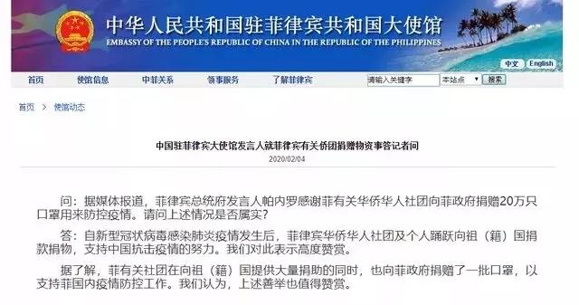 4日,中国驻菲律宾大使馆发文澄清。中国驻菲律宾大使馆发言人表示,自新型冠状病毒感染的肺炎疫情发生后,菲律宾华侨华人社团及个人向祖(籍)国捐款捐物,支持中国抗击疫情的努力。与此同时,菲律宾华侨华人社团也向菲政府捐赠了一批口罩,以支持菲律宾国内疫情防控工作。