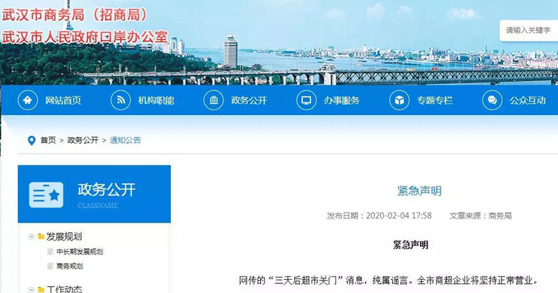 2月4日,武汉市商务局发布紧急声明:网传的“三天后超市关门”消息,纯属谣言。全市商超企业将坚持正常营业。