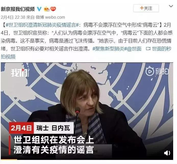 世卫组织官员对此作出澄清,这不是事实,病毒是通过飞沫传播,只有近距离才会被传染。