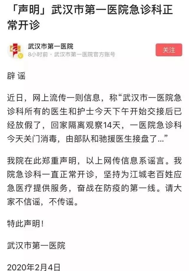 对此,武汉市第一医院郑重声明,该信息系谣言。该院急诊科一直正常开诊,坚持为江城老百姓应急医疗提供服务,奋战在防疫的第一线。