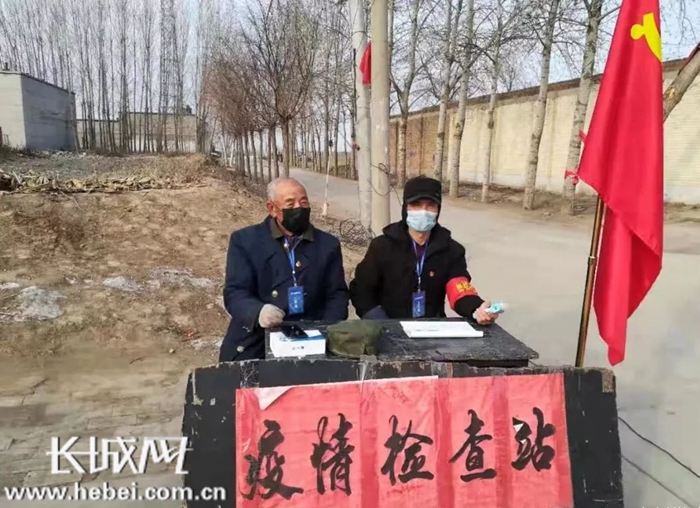 张栓来(左)正在董庄村的一处疫情检查站执勤。