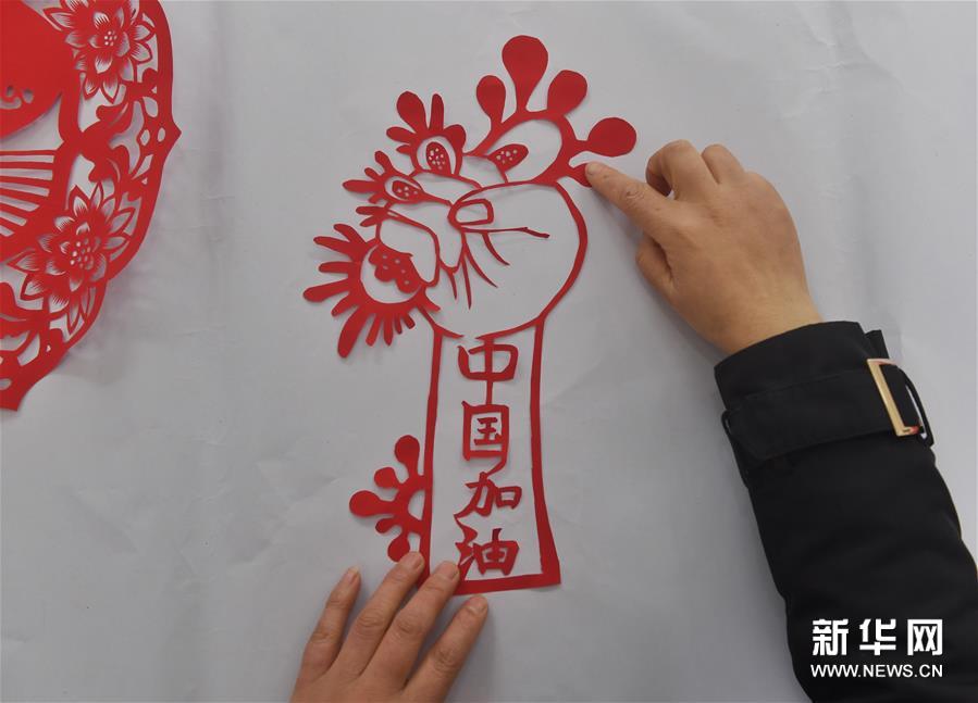 2月8日,华光村剪纸爱好者在装裱创作完成的防疫宣传剪纸。新华社记者刘坤摄