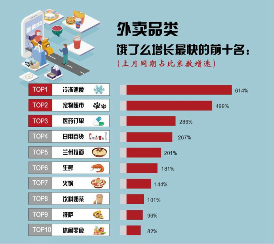1.环比12月份,冷冻速食增长了6倍,是目前“饿了么”平台外卖品类中占比增长最快的一个品类。