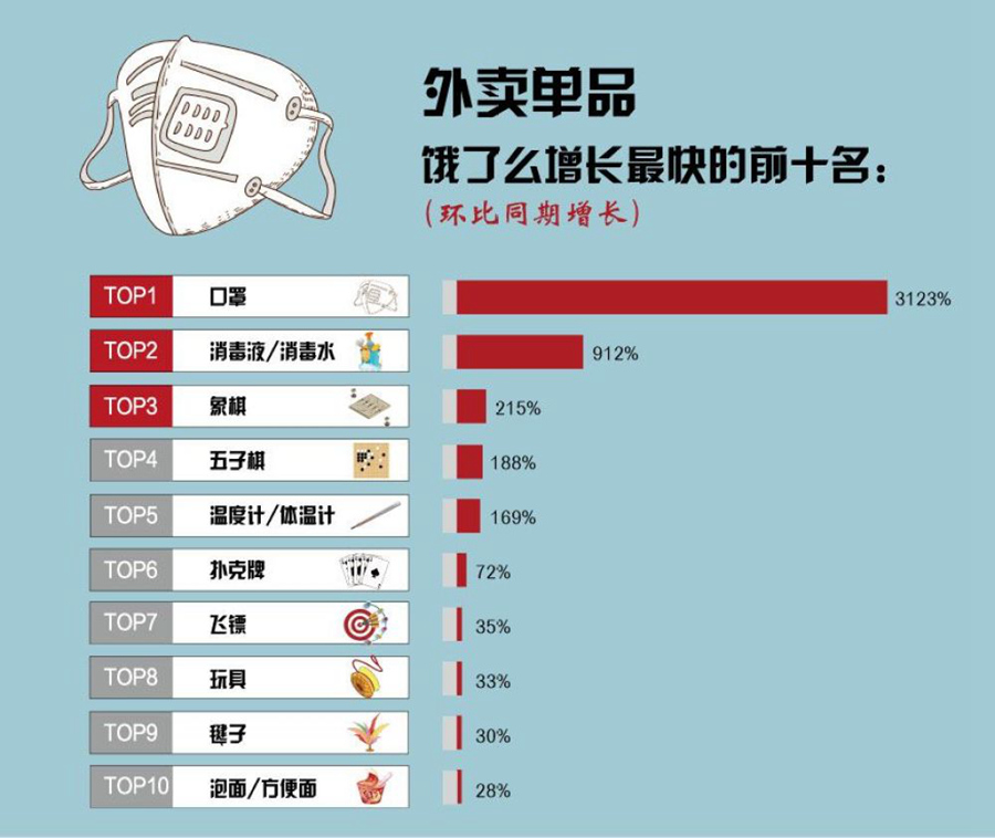 1.“饿了么”数据显示,在所有外卖物品中,口罩的销量增速居首位,环比上月同期增长了31倍。消毒液紧随其后,增长了9倍。难怪,不少小伙伴直呼,当前“坐拥”几百个口罩宅家的都是“大富豪”啊!