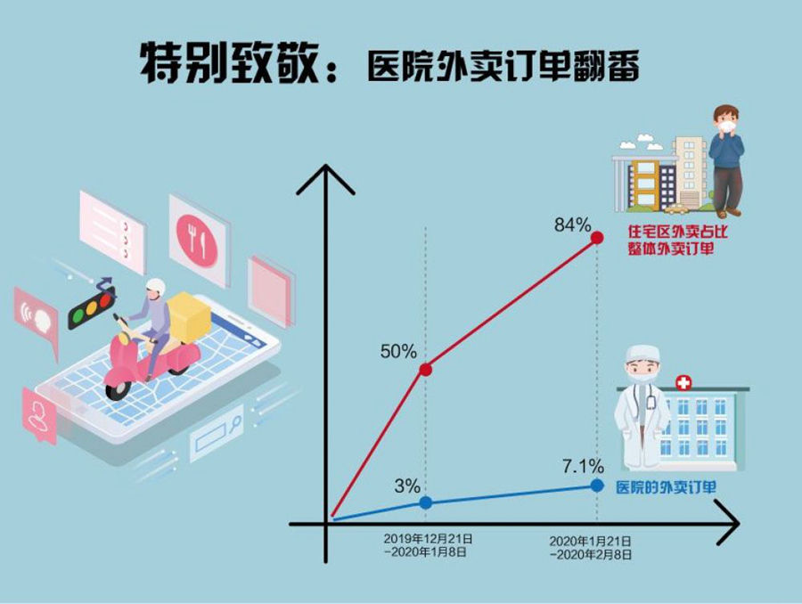 “饿了么”数据显示,自疫情爆发以来,医院的外卖订单占比上升了一倍,加班加点,外卖订单猛增,让我们向战斗在一线的医务工作者致敬!