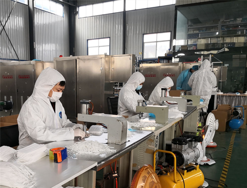 雄安新区雄县一家医疗设备生产企业转产口罩,工人们正在加班加点生产。新华社记者曹国厂摄