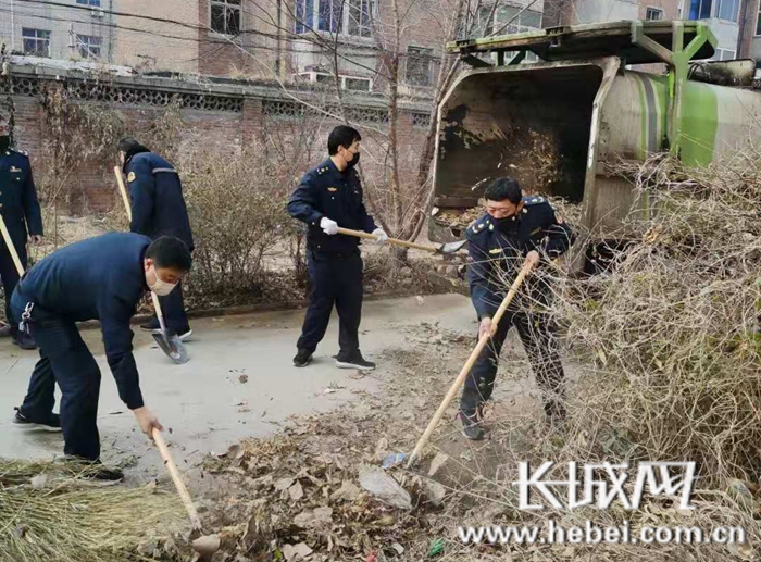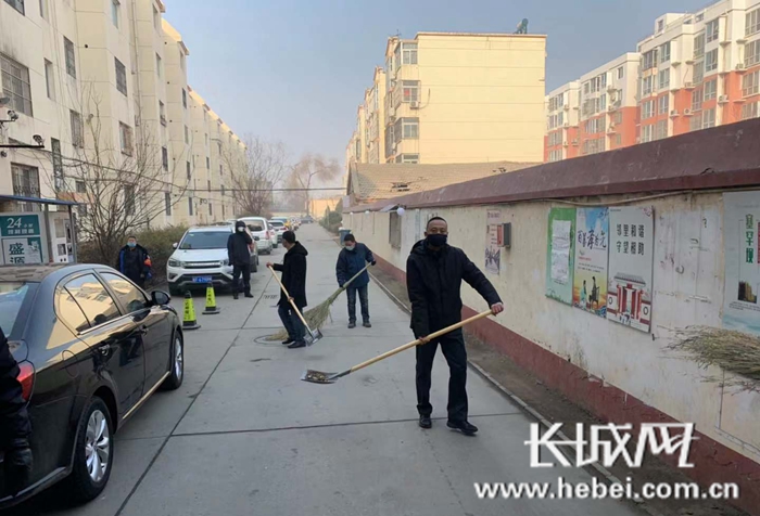 安新县交通运输局的党员干部正在清理康欣园小区的卫生。