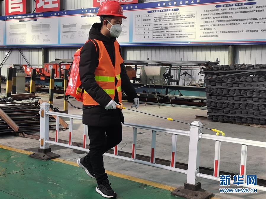 工作人员对中铁二十局集团有限公司津石高速公路十一标项目部的生产车间进行消毒(2月23日摄)。 新华社发(刘惟真 摄)