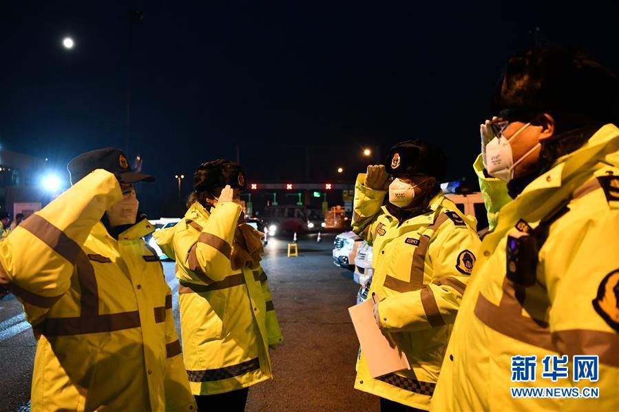 在津沧高速出口前毕庄收费站,天津市交通运输综合行政执法总队的执法队员进行交接班换岗工作(2月8日摄)。 新华社记者 李然 摄
