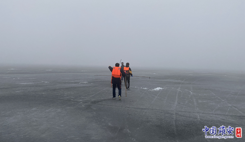 沿着冰面,河北雄安新区生态环境局监测人员张京身穿救生衣,趁着凌晨天冷冰硬还能上人,一步步地往白洋淀淀中心挪,每前进一步,脚下的冰层都会发出咔嚓声。