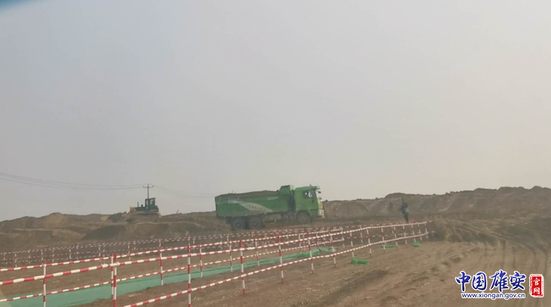 中铁九局弃土场及运输车辆。河北雄安新区生态环境局供图