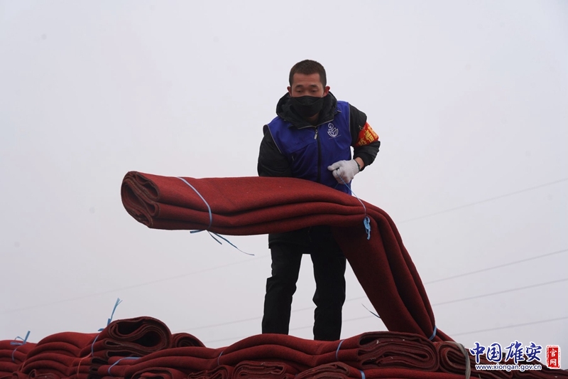 崔涛正在发放消毒地毯。中国雄安官网发