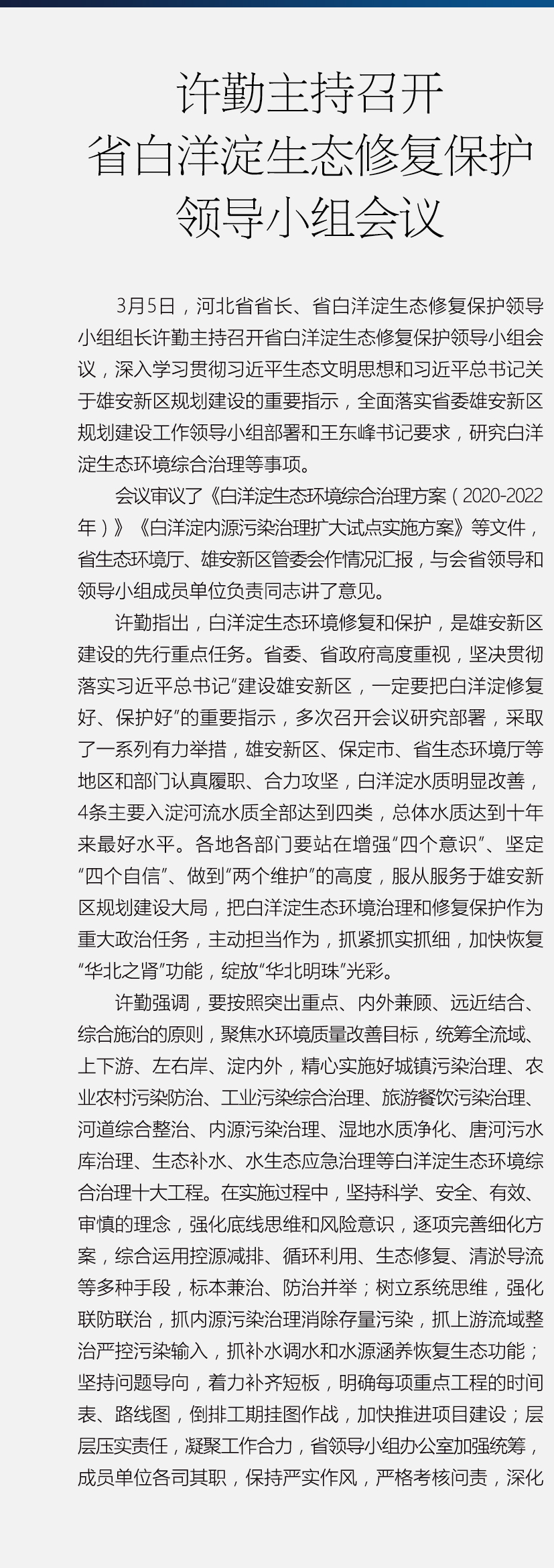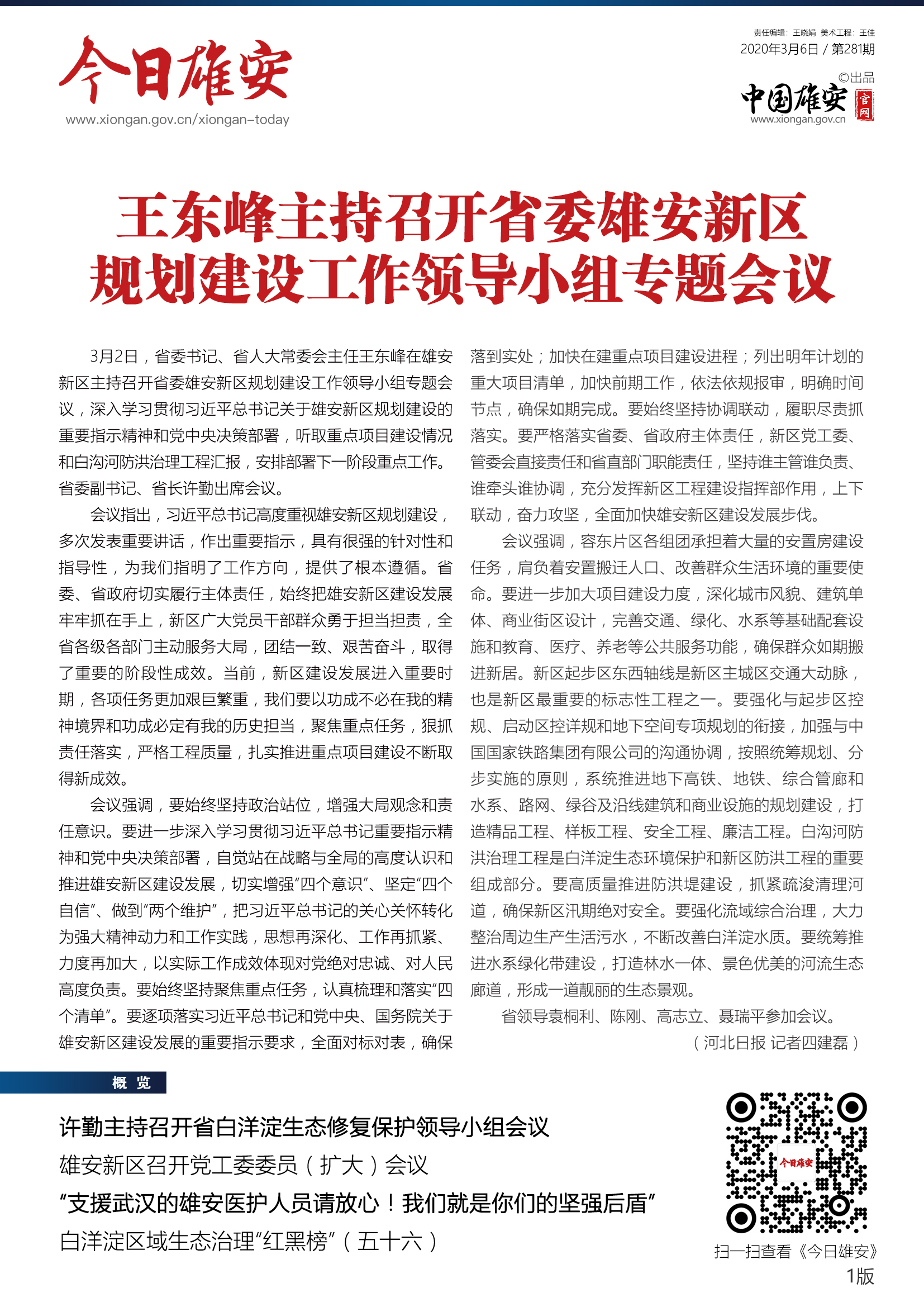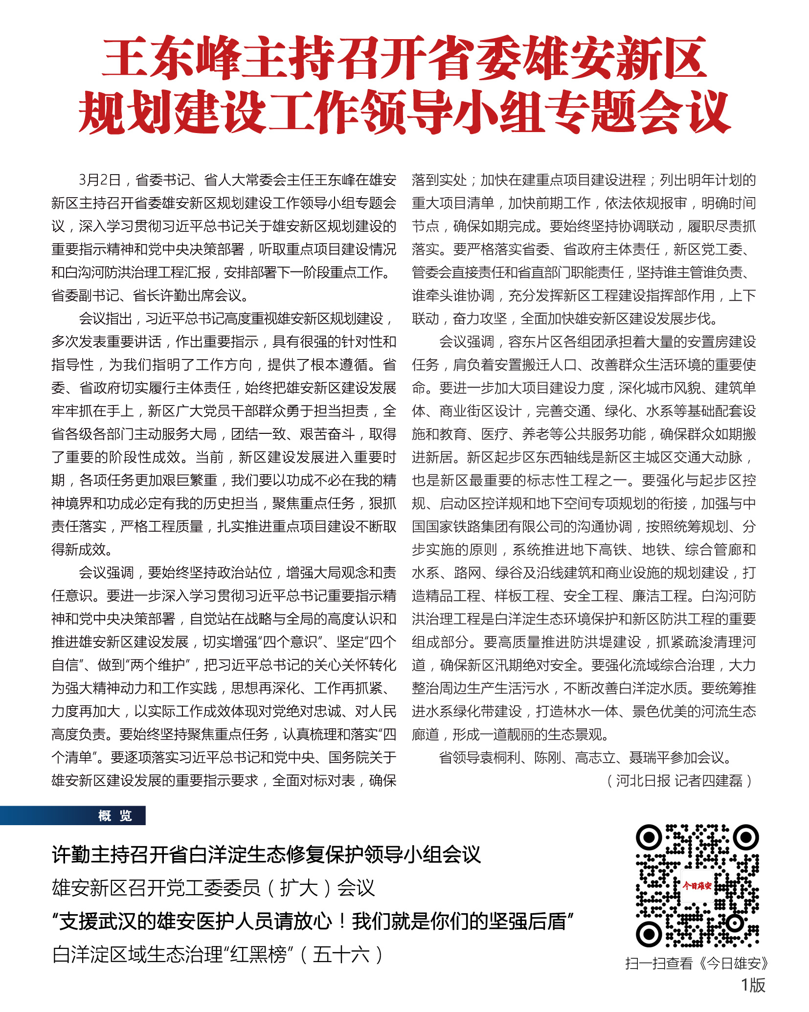 3月2日,省委书记、省人大常委会主任王东峰在雄安新区主持召开省委雄安新区规划建设工作领导小组专题会议。