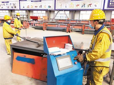 京雄高速复工复建获得批复后,全力推进施工进度。图为工人们在操作自动弯弧机加工钢筋。河北日报记者 张伟亚摄