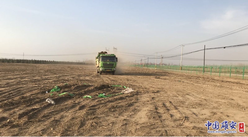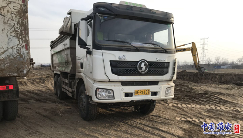 冀北中原园林有限公司承建的河北雄安绿博园廊坊园内运输车辆无绿色环保标志。雄安新区生态环境局供图
