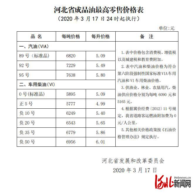 从河北省发展和改革委员会获悉,根据现行成品油价格形成机制,自3月17日24时起,河北省 汽、柴油价格(标准品)每吨分别降低 1015 元、975 元,调整后的汽、 柴油最高零售价格见下表。乙醇汽油价格按同标号汽油(ⅥA)价格执行, 普通柴油价格按照同标号车用柴油(Ⅵ)价格执行,98 号汽油价格由成 品油生产经营企业根据市场情况自主制定具体价格。(李博)