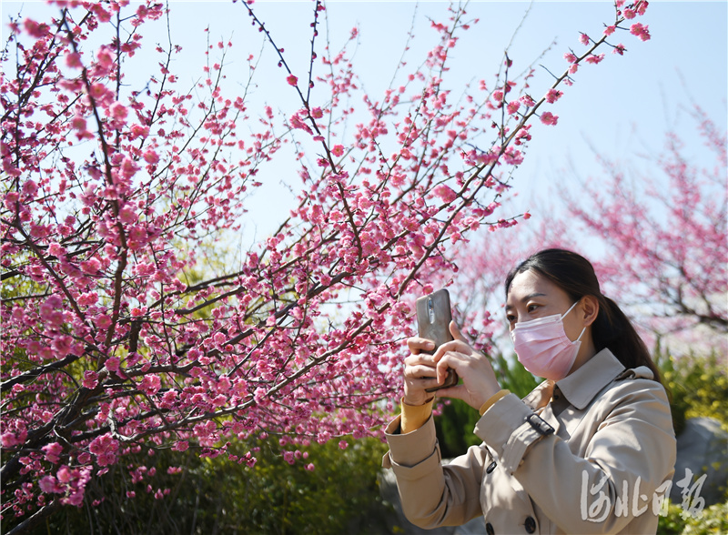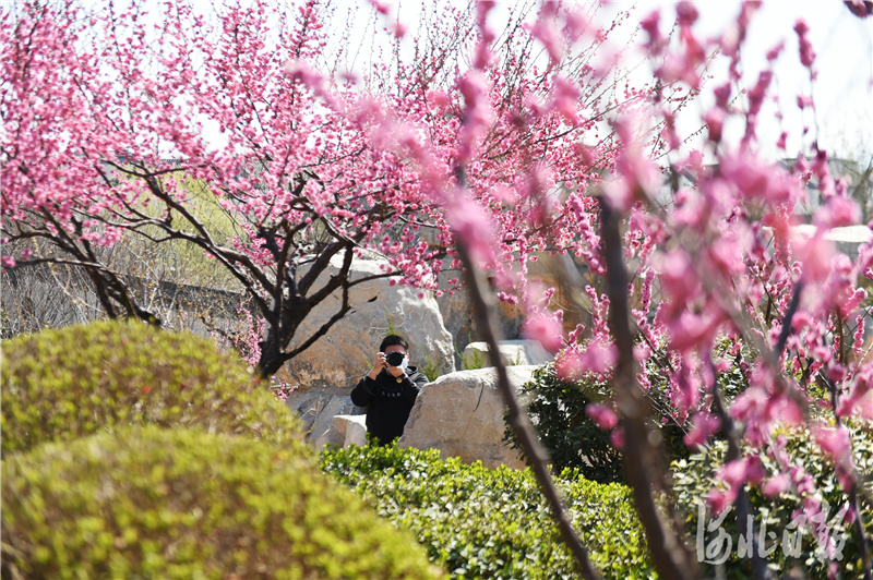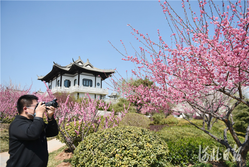 3月17日,在邯郸市磁县磁州水墨园,游客在梅花树下拍照留念。连日来,该县磁州水墨园内的梅花竞相绽放,春意盎然,在仿古建筑的映衬下,格外美丽,吸引人们前来观赏采风。河北日报记者史晟全摄影报道