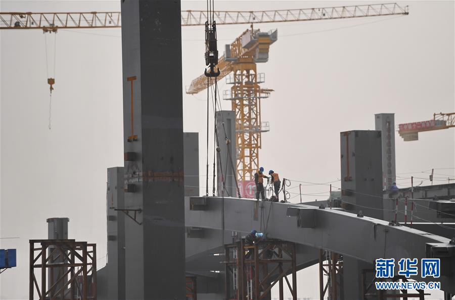 3月18日,工人在京雄城际铁路雄安站建设现场施工。 记者从河北雄安新区管委会了解到,近日,在做好疫情防控的前提下,河北雄安新区积极推动重点项目复工。截至3月18日8时,雄安新区已有67个重点项目复工。 新华社记者 牟宇 摄