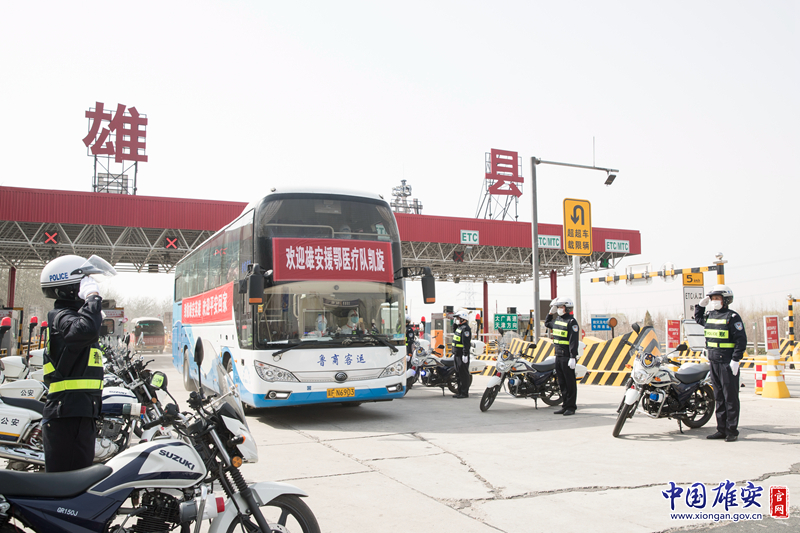 荣乌高速雄县出口处,交警列队敬礼,向白衣战士致敬。中国雄安官网记者李鑫 摄