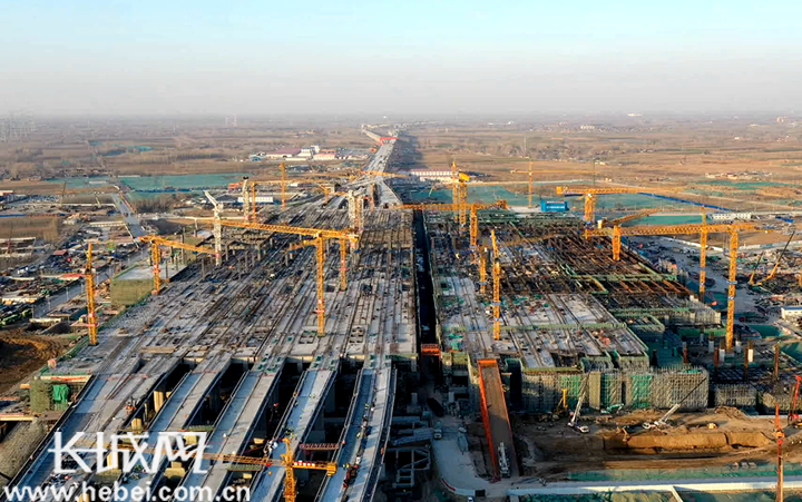 航拍京雄城际铁路雄安站建设现场。