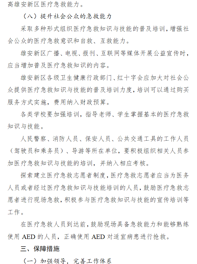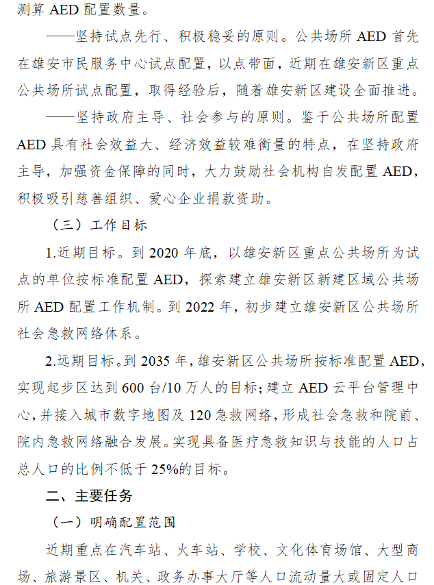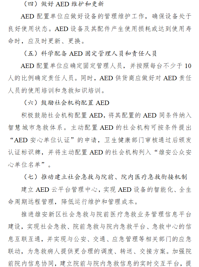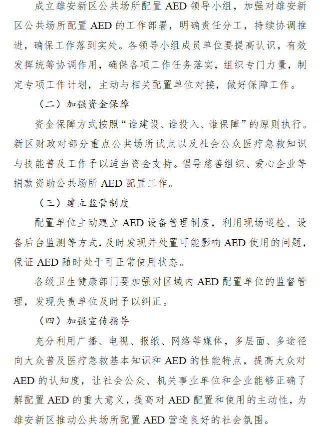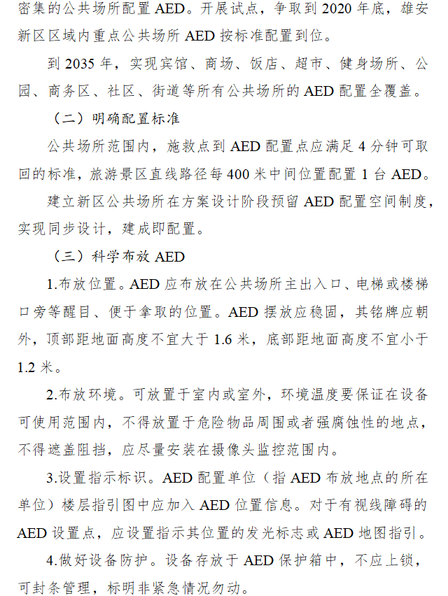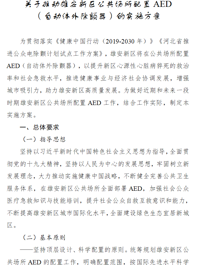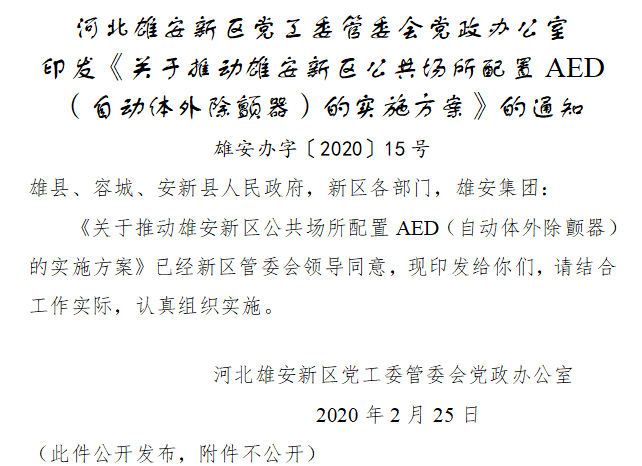 河北雄安新区党工委管委会党政办公室印发《关于推动雄安新区公共场所配置AED(自动体外除颤器)的实施方案》的通知