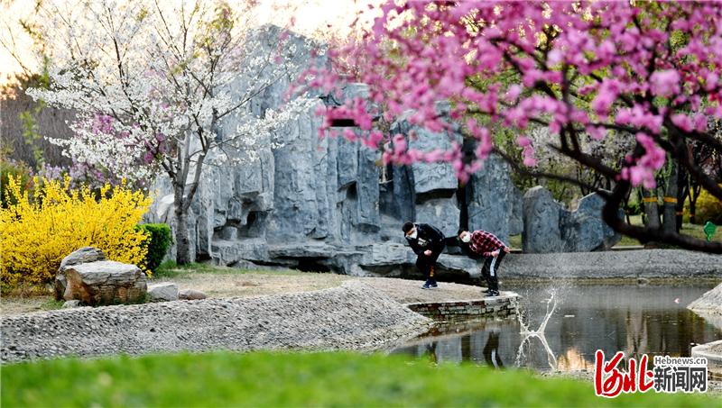 2020年3月27日,在河北省石家庄市栾城区鲜花盛开的樱花公园里,两名小伙子在玩打水漂。通讯员李明发摄影报道