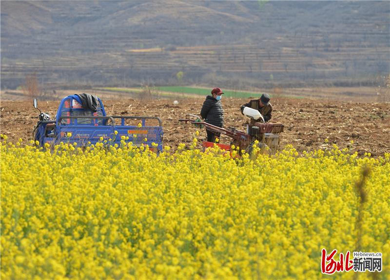 2020年3月27日,河北省元氏县黑水河村农民在油菜花地准备春耕。通讯员黄旭摄影报道