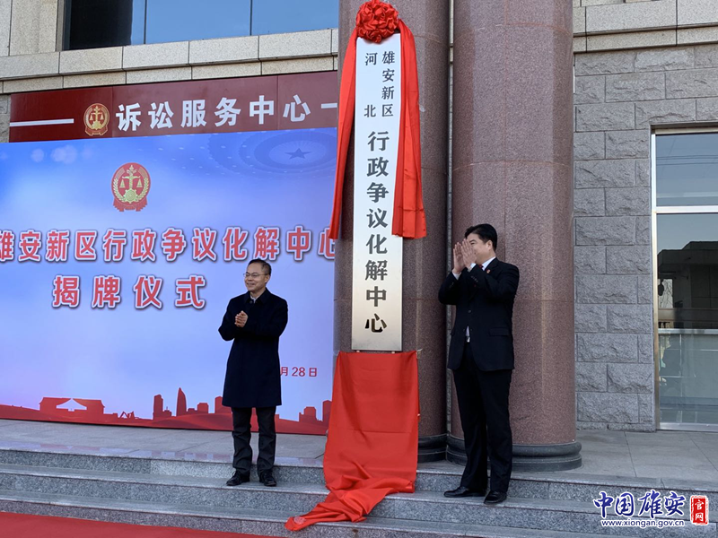 雄安新区党工委委员、管委会副主任梁远和雄安新区中级人民法院党组书记、院长刘光辉共同为雄安新区行政争议化解中心揭牌。中国雄安官网记者牛思佳 摄