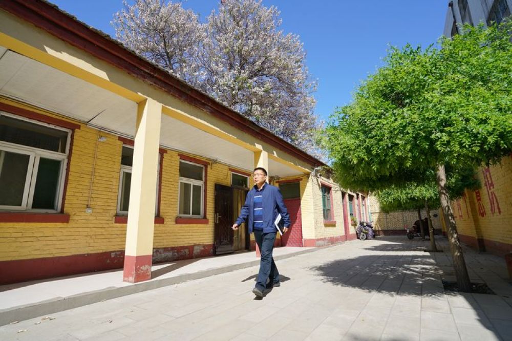 鲁昊从宿舍走出去新庄窠村开会(2019年4月30日摄)。新华社记者牟宇 摄