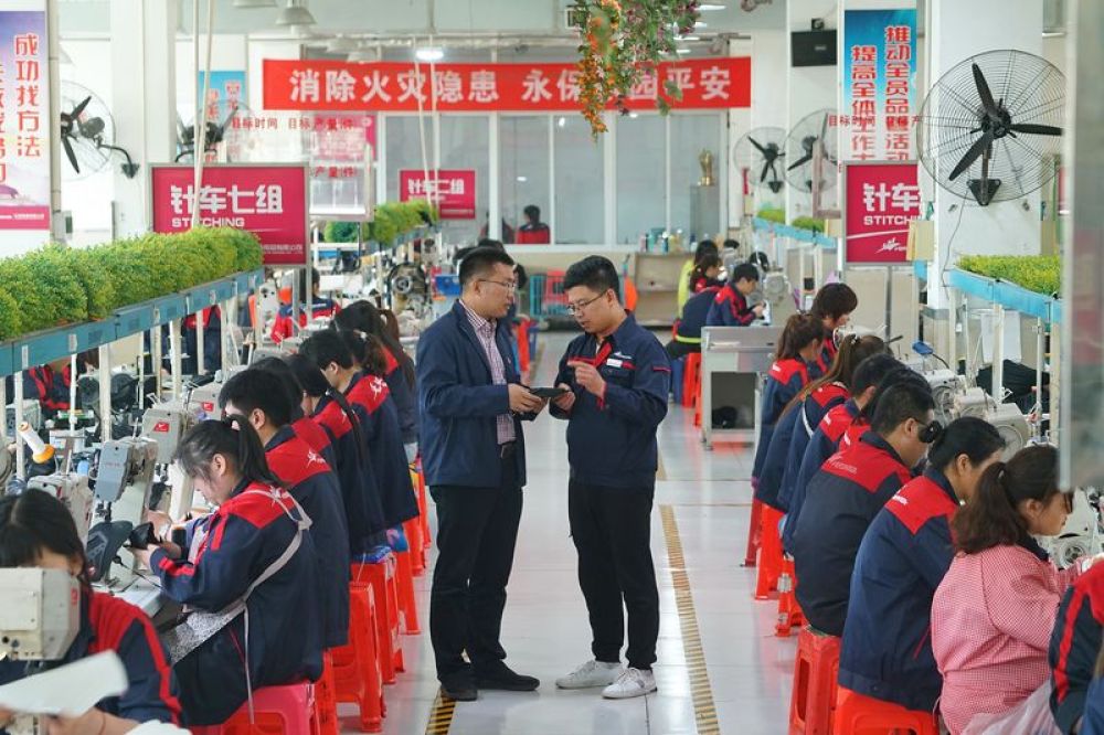 鲁昊(中左)在三台镇一家制鞋企业内向企业负责人了解生产情况(2019年5月1日摄)。新华社记者牟宇 摄