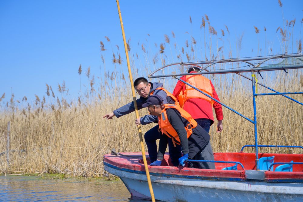 鲁昊(中)在白洋淀内调研生态状况(3月27日摄)。新华社发(刘东尧 摄)