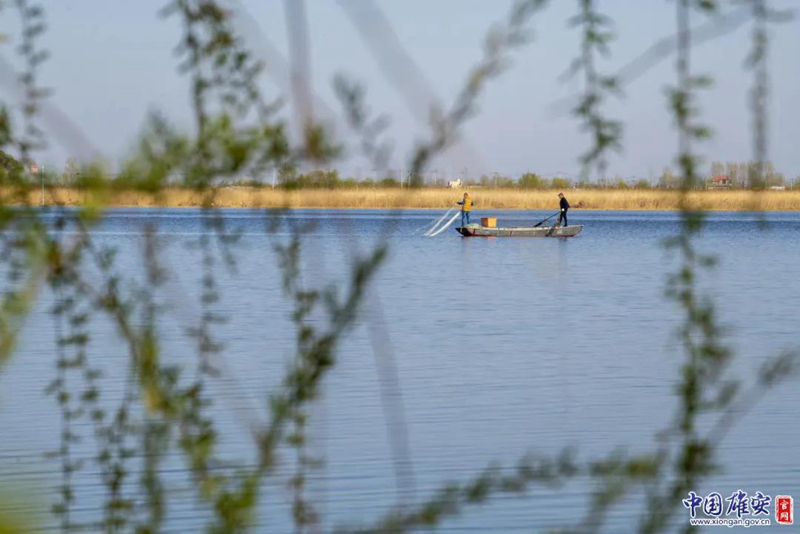 安新县端村镇大淀头村村民用粘网捕鱼。