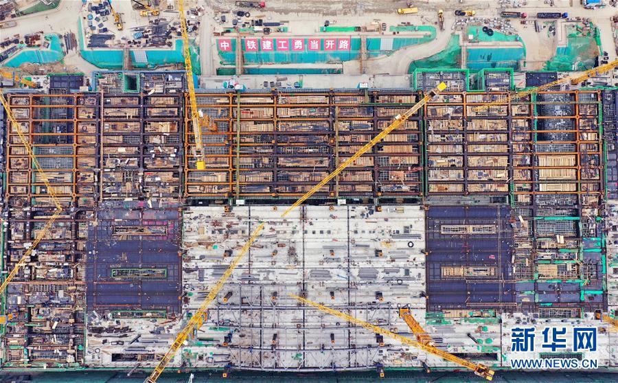 京雄城际铁路雄安站施工现场(3月25日拍摄,无人机照片)。新华社记者 牟宇 摄