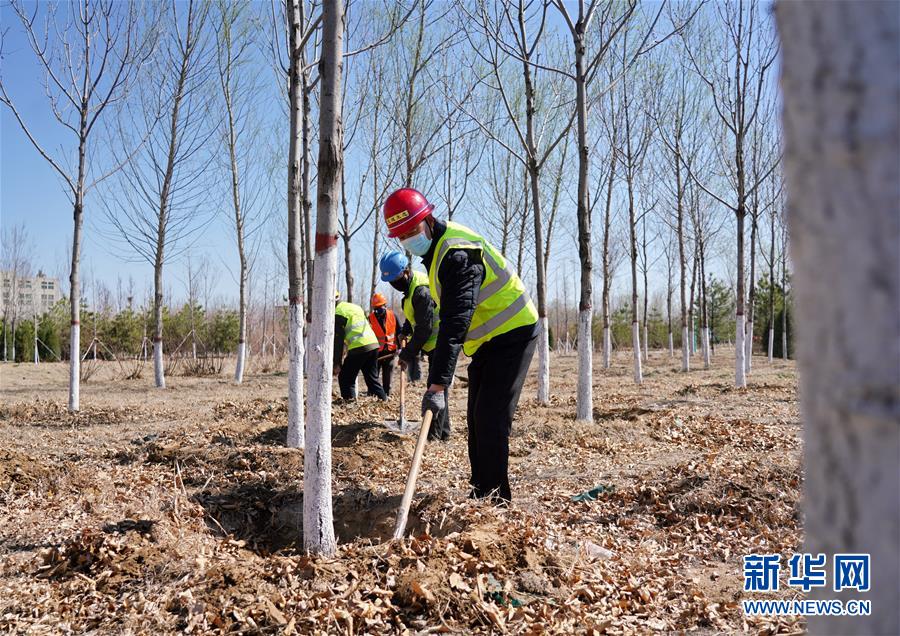 工人在河北雄安新区“千年秀林”内养护树木(3月19日摄)。新华社记者 杨世尧 摄