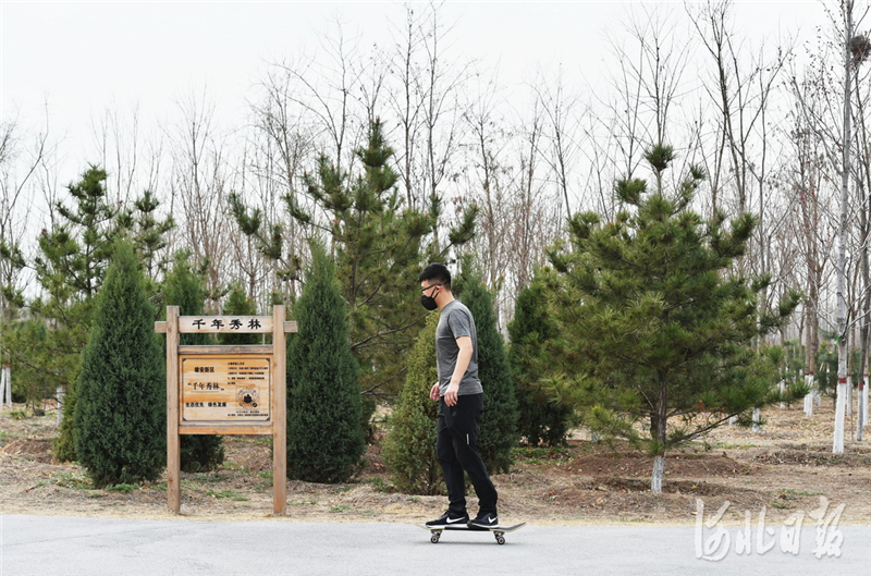 2020年3月21日,一位游客在千年秀林的甬路上滑滑板。河北日报记者赵海江摄影报道