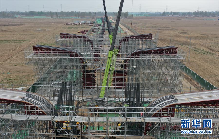 4月9日,中交一公局集团的工人在京雄高速兰沟洼特大桥建设工地施工(无人机照片)。目前,京雄高速公路建设正在按照节点有序推进。京雄高速是雄安新区“四纵三横”区域高速公路网的重要组成部分,也是连接北京城区和雄安新区便捷的高速通道。项目计划于2020年底主体建成,2021年上半年全线通车。新华社记者 杨世尧 摄