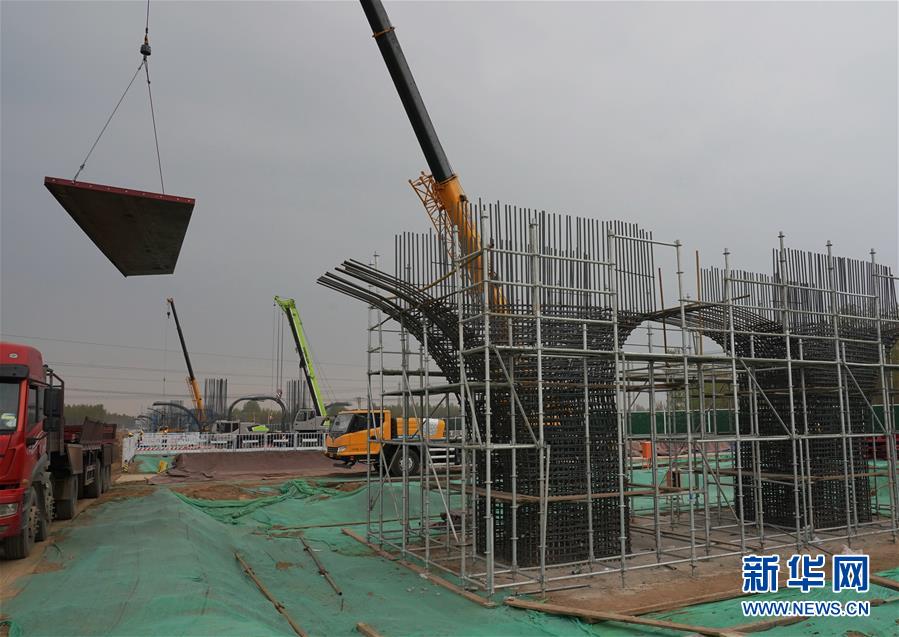 4月9日,中交一公局集团的工人在京雄高速兰沟洼特大桥建设工地施工。目前,京雄高速公路建设正在按照节点有序推进。京雄高速是雄安新区“四纵三横”区域高速公路网的重要组成部分,也是连接北京城区和雄安新区便捷的高速通道。项目计划于2020年底主体建成,2021年上半年全线通车。新华社记者 杨世尧 摄