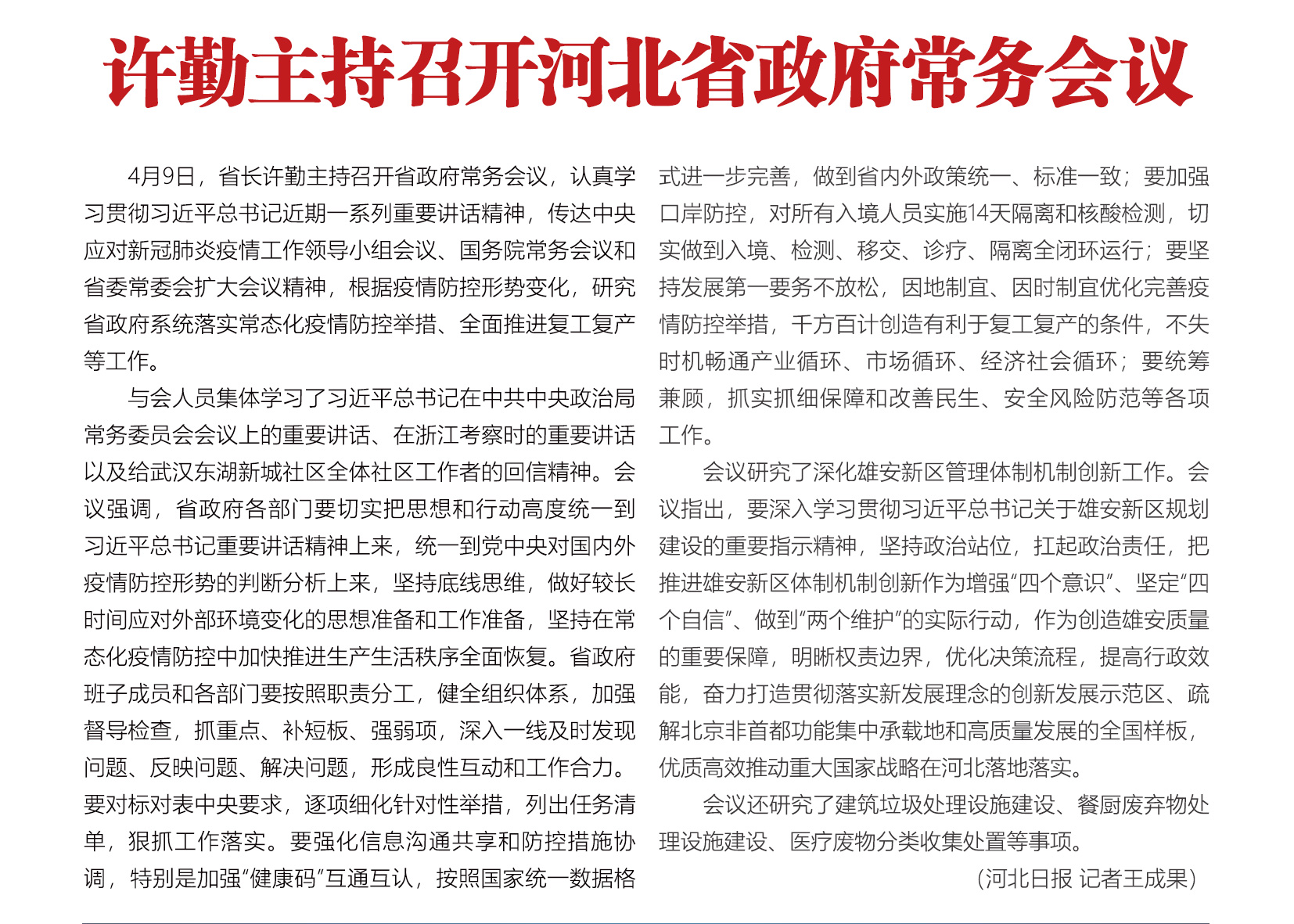 4月9日,省长许勤主持召开省政府常务会议,认真学习贯彻习近平总书记近期一系列重要讲话精神,传达中央应对新冠肺炎疫情工作领导小组会议、国务院常务会议和省委常委会扩大会议精神。