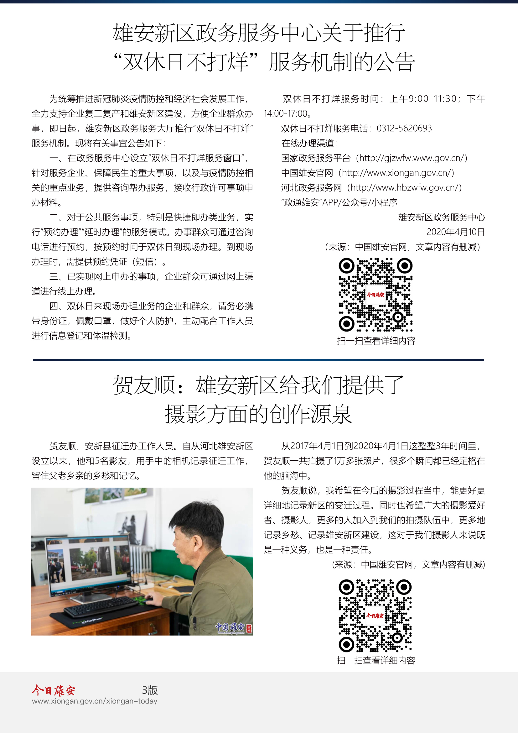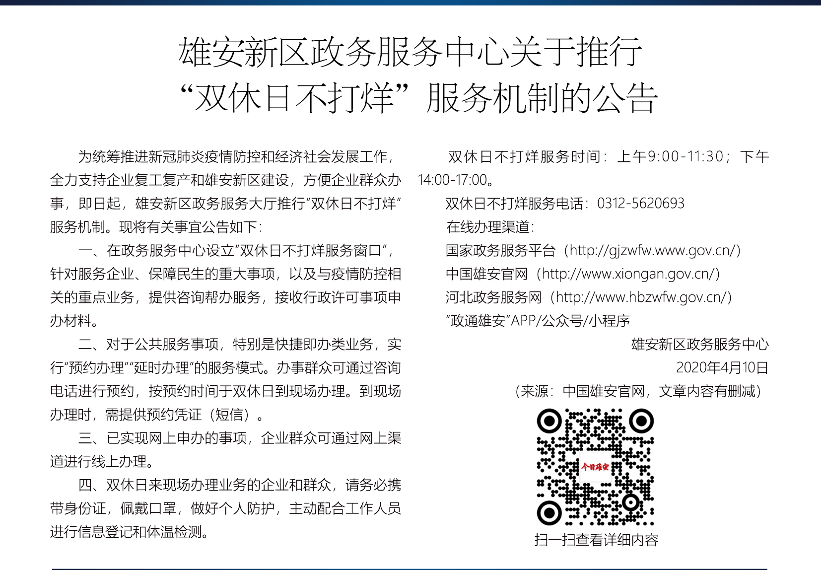雄安新区政务服务中心关于推行“双休日不打烊”服务机制的公告