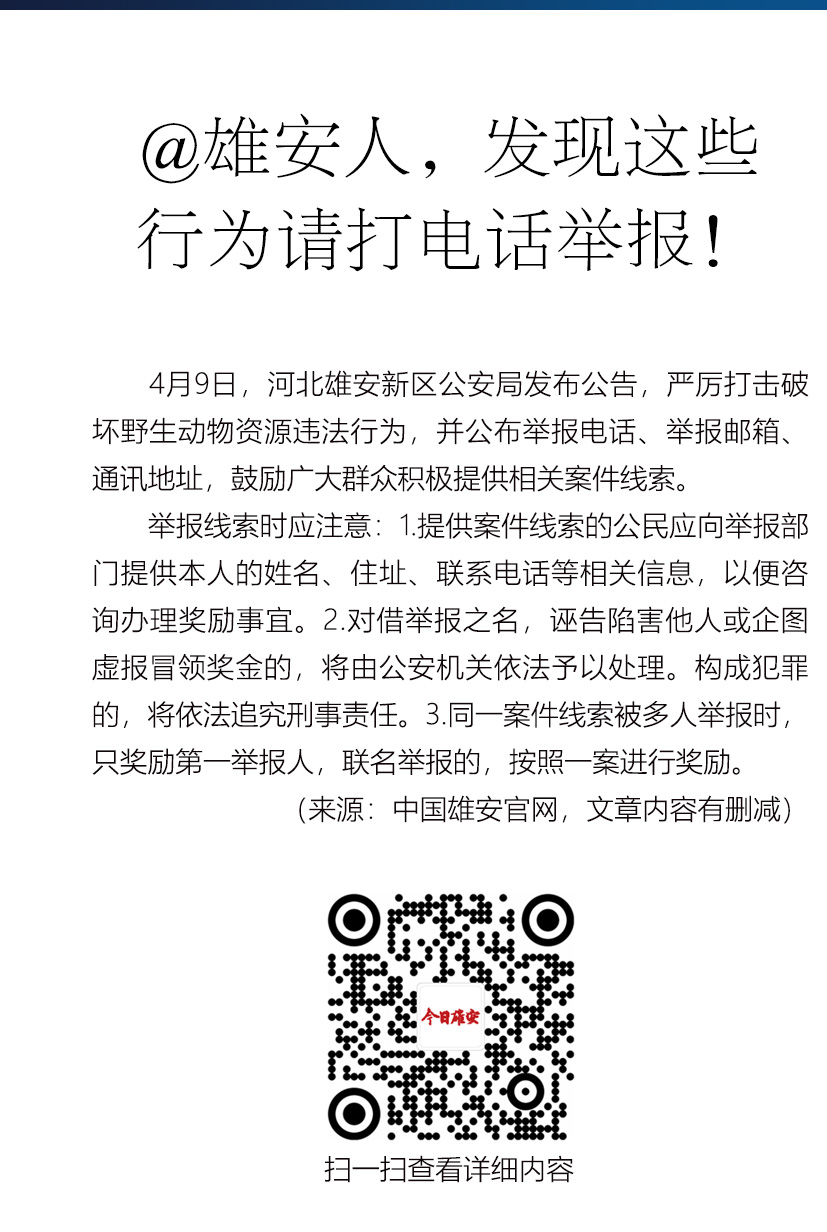 雄安新区公安机关严厉打击破坏野生动物资源违法行为向社会群众公布举报电话的公告